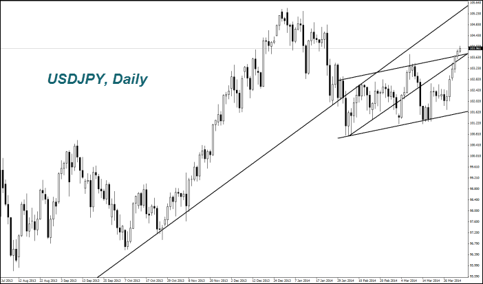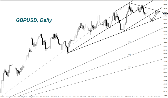 The British Pound ( GBPUSD ) strengthened (growth on the chart ) against both the U.S. Dollar and the Euro. Market participants expect the tightening of monetary policy over the next 12 months. The head of the Bank of England, Mark Carney announced that the interest rate can increase till the next elections (in the second quarter of 2015 ), if there is an increase in jobs . Yesterday though construction PMI for March turned out worse than expected, it was still 62.5 points. That calmed investors and supported the Pound. Prior to this, weak PMI manufacturing was released on Tuesday for March, as well. Today at 10:30 CET PMI Services and Composite PMI will be released. The forecast is neutral . On Friday no economic data will be in the UK, and the next will be released only on April 10th.