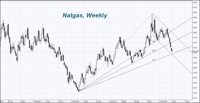 The price of natural gas dropped. The weekly volume of net-long positions fell 11%, according to the CFTC. Gas is widely used to produce electricity. Electricity generation slumped 11% in mid-July, compared with the previous year, and has reached the lowest level since 2001, according to Edison Electric Institute. The delivery volume of natural gas to power plants has fallen 13% to its low since 2009, according to LCI Energy Insight. Weak demand for electricity can be explained by the fact that the current July is the coldest in the U.S. in five years. Due to this the residents are not likely to switch on the air conditioning. Meanwhile, a number of market participants assume that gas starts competing with coal as a fuel resource, considering its price 3.75-3.5 per million BTU. Therefore, these levels may be considered as a "technical support".