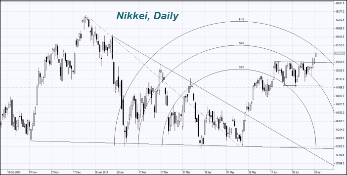 Nikkei continued to grow. As we have already pointed out in the previous overviews, it was in the sideways trend from mid-June and has considerably fallen behind the raised U.S. and European indices. Nissan Motor and Keyence Corp. good reporting contributed to the current index growth: the stocks of other Japanese exporters rose in prices as well following the reporting. The statements outperformed the weak economic data on Unemployment and Retail Sales. Tonight at 23-50 CET Industrial Production in Japan in June is to come out: the forecast seems to be positive.