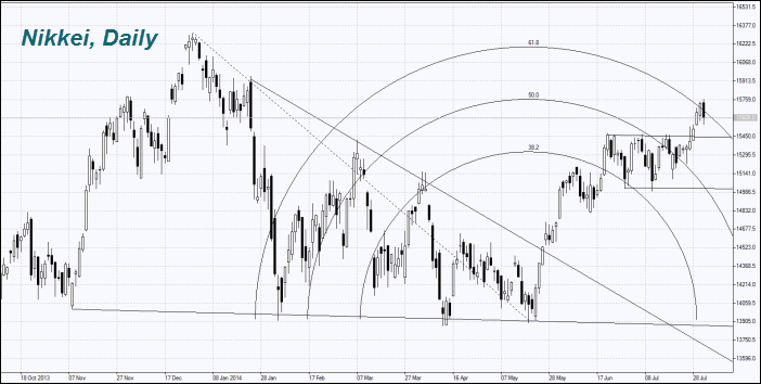 Nikkei updated its annual high yesterday. Investors believe that the income of Japanese exporters is to be increased, due to the American economy recovery and US GDP growth in the second quarter. A possible increase in American discount rates yesterday contributed to four-month high daily strengthening of the dollar against the yen. Today, Nikkei is dropping in line with the global trend, and also due to poor earnings report of Nintendo caused by lower sales of Wii U game console. At 1-35 CET Japanese PMI for July by Markit is to be released tomorrow early morning. Haruhiko Kuroda, current Governor of the Bank of Japan, is giving a speech at 3-30 CET.