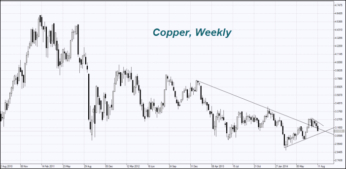 Copper prices continued to fall today amid the concerns on Chinese demand reduction, due to a possible economy slowdown. Premia and expenses for this metal on the London Metal Exchange fell to its lowest level since last June and amounted to $70 per ton. Some market participants predict the copper excess of 226,000 tons on the world market this year, and in 2015 – 285,000 tons. Copper shortage of 193,000 tons was observed on the world market in 2013, according to International Copper Study Group data, and prices dropped as a result. It should be noted that China consumes approximately 40% of the world copper produced. In July the reduction in country supplies happened for the third month in a row and reached 2.9% compared to June. The volume fell to the lowest level since April 2013 and amounted to 340,000 tons.