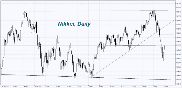 Nikkei has risen 4% today, the highest increase since June 2013. The Japanese Government Pension Investment Fund is planning to increase the shares of Japanese companies in its assets ($1.2 trillion) from 12% to 25%. At the same time it would reduce the share of Japanese bonds from 60% to 40%. Earlier, we have repeatedly emphasized that the fund is going to raise the share of local stake in the assets, but the level of 25% surpassed the expectations of market participants. This is what influenced the Nikkei’s boost. Additional positive information was the price growth of such Japanese exporters as Toyota (+5.2%), Honda (+3.5%) and Panasonic (+4.5%) due to the yen weakening (it looks like the rise from the 5-week low on the chart). NEC Corporation (+ 6.5%) published a good earnings report. We would like to note that Nikkei upped amid the domestic political crisis, which may have an impact later. The Prime Minister Shinzo Abe has dismissed several ministers of his cabinet.