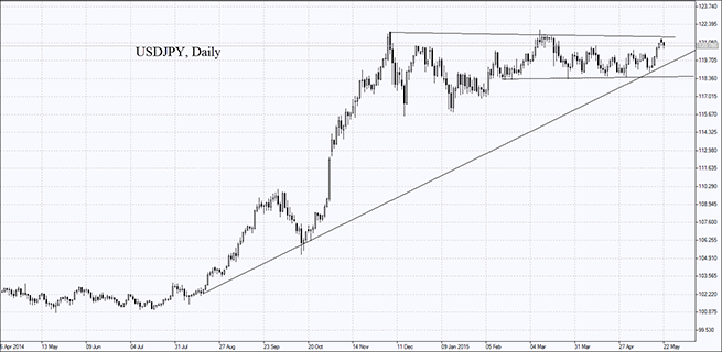 Nikkei has been rising for 6 straight days — the longest winning streak since December. The index has been traded close to the maximum since December, 1989. The growth is boosted by Bank of Japan, which decided today to keep money emission at the current level (80 trn yen). It is worth mentioning that good Q1 GDP data were issued on Wednesday. Investors praise governmental economic policy, known as “Abenomics”. Today Bank of Japan stated the program would continue and expressed confidence that inflation will reach the 2% goal in 6 months. The yen weakened because market participants expected the policy would remain unchanged. Yet, the Japanese currency strengthened on positive GDP report. Altogether, the yen have been traded in a range for 6 months, which may result in a quick and sharp momentum.