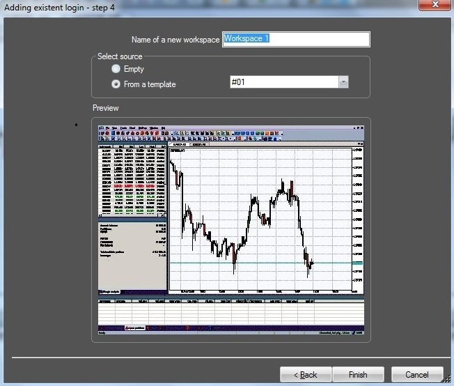 After clicking on the "Finish" button you can see your account in the "Navigator" window in the drop-down list of Logins.