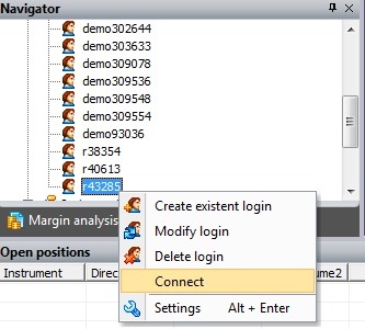 For connecting the account select it from the list of "Logins" in "Navigator" window. You just need to double-click on it and connect to that account by pressing "OK". Additionally, you can connect to your account if you call the context menu by right-clicking on the account number and selecting "Connect" option.