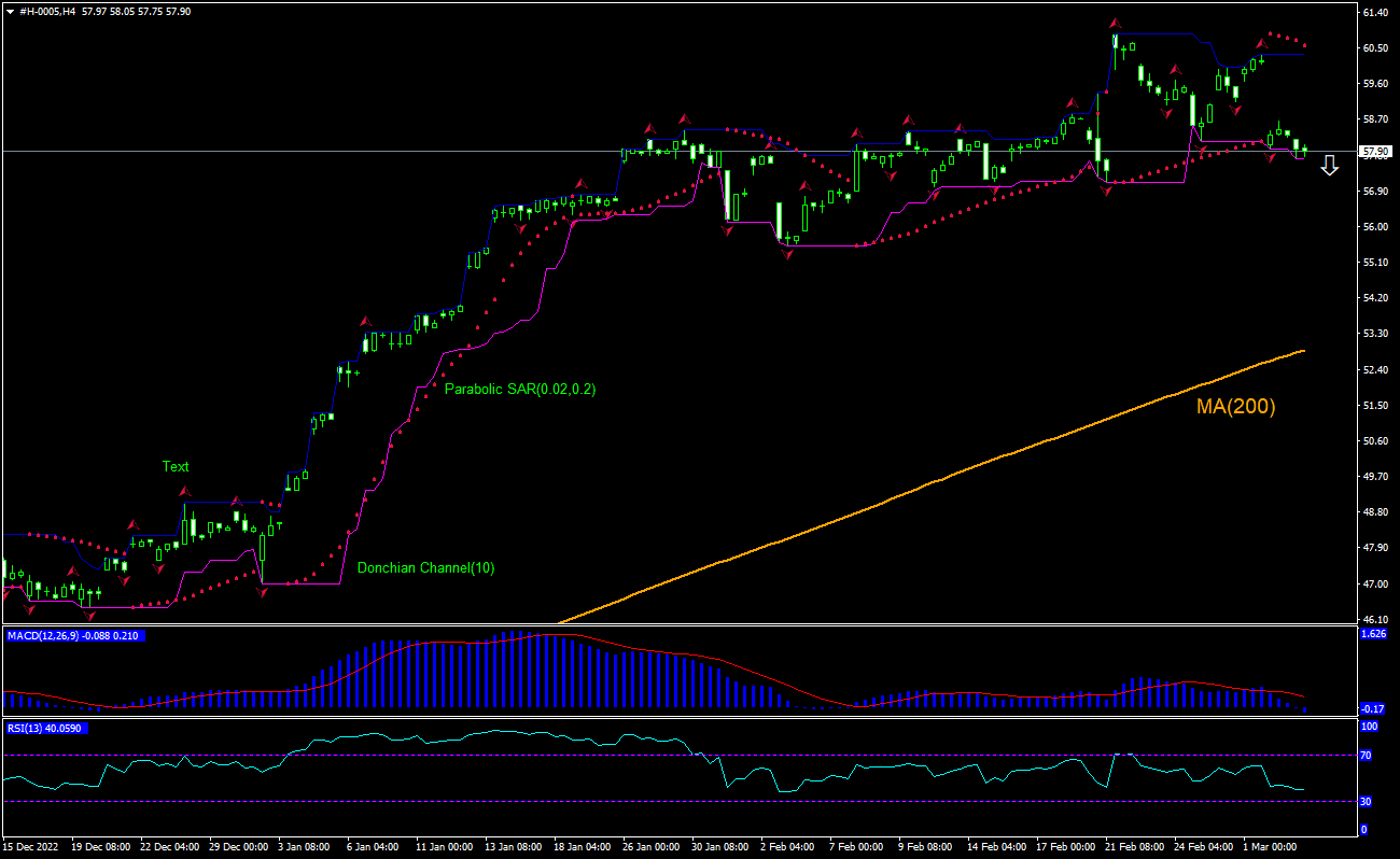 The technical analysis of the HSBC stock price chart on 4-hour timeframe shows #H-0005,H4 is retracing down toward the 200-day moving average MA(200) after hitting 38-month high two weeks ago. We believe the bearish momentum will continue after the price breaches below the lower boundary of Donchian channel at 57.70. This level can be used as an entry point for placing a pending order to sell. The stop loss can be placed above the upper boundary of Donchian channel at 60.35. After placing the order, the stop loss is to be moved every day to the fractal high indicator, following Parabolic indicator signals. Thus, we are changing the expected profit/loss ratio to the breakeven point. If the price meets the stop loss level (60.35) without reaching the order (57.70), we recommend cancelling the order: the market has undergone internal changes which were not taken into account.