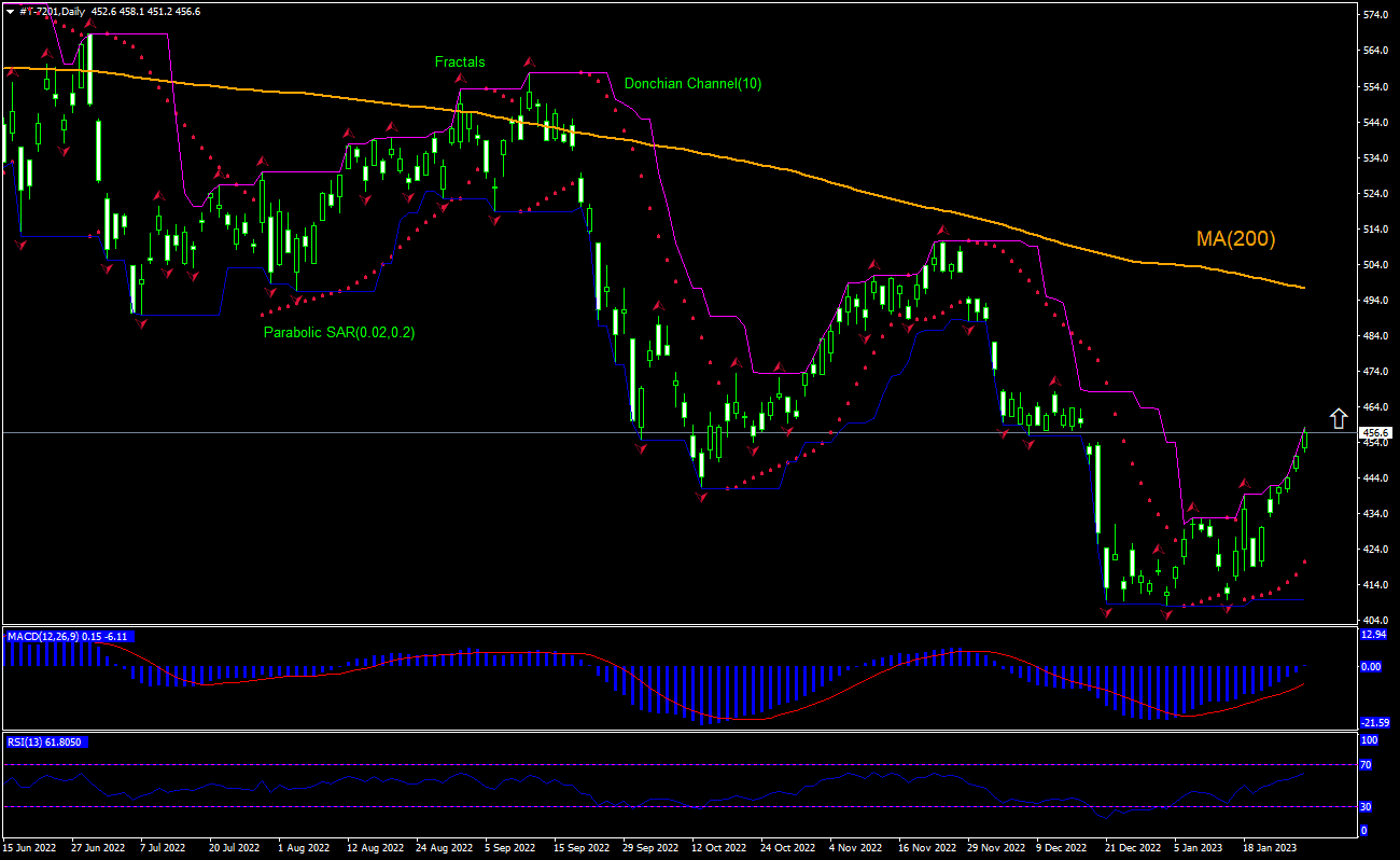 The technical analysis of the Nissan Motor stock price chart on daily timeframe shows #T-7201,Daily has reversed its declining after falling to 26-month low four weeks ago. The 200-day moving average MA(200) is still falling. We believe the bullish momentum will continue after the price breaches above the upper bound of the Donchian Channel at 458.1. This level can be used as an entry point for placing a pending order to buy. The stop loss can be placed below 439.4. After placing the order, the stop loss is to be moved every day to the next fractal low, following Parabolic indicator signals. Thus, we are changing the expected profit/loss ratio to the breakeven point. If the price meets the stop loss level (439.4) without reaching the order (458.1), we recommend cancelling the order: the market has undergone internal changes which were not taken into account.