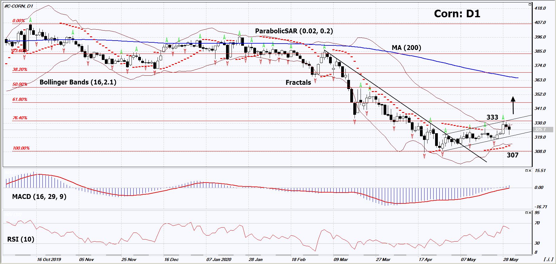 On the daily timeframe, Corn: D1 beached up the resistance line of the short-term downtrend. Now it is in a growing channel, correcting upward from the minimum since 2009 and has reached the 1st Fibonacci level. A number of indicators of technical analysis formed signals for a further increase. We do not exclude a bullish movement if Corn rises above the last upper fractal, the upper Bollinger line and the 1st Fibonacci level: 333. This level can be used as an entry point. We can set a stop loss below the Parabolic signal, the lower Bollinger line and the minimum since 2009: 307. After opening a pending order, the stop loss should be moved following the Bollinger and Parabolic signals to the next fractal minimum. Thus, we change the potential profit / loss ratio in our favor. After the transaction, the most risk-averse traders can switch to a four-hour chart and set a stop loss, moving it in the direction of the trend. If the price meets the stop loss level (307) without activating the order (333), it is recommended to delete the order: the market sustains internal changes not taken into account.