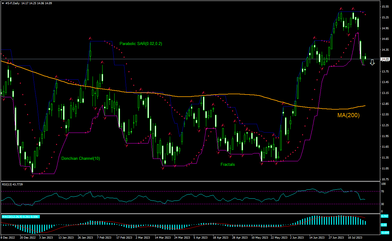The technical analysis of the Ford stock price chart on daily timeframe shows #S-F,Daily is retracing down toward the 200-day moving average MA(200) after hitting 10-month high a week ago. We believe the bearish momentum will resume after the price breaches below the lower boundary of Donchian channel at 13.92. This level can be used as an entry point for placing a pending order to sell. The stop loss can be placed above 14.63. After placing the order, the stop loss is to be moved every day to the next fractal high, following Parabolic indicator signals. Thus, we are changing the expected profit/loss ratio to the breakeven point. If the price meets the stop loss level (14.63) without reaching the order (13.92), we recommend cancelling the order: the market has undergone internal changes which were not taken into account.