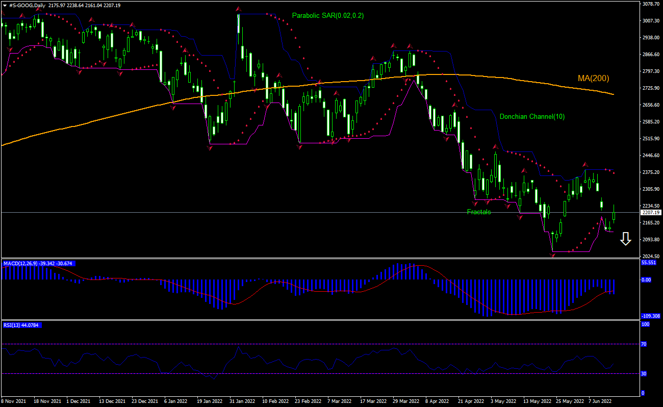 The technical analysis of the GOOGLE stock price chart on daily timeframe shows #S-GOOG,Daily is falling under the 200-day moving average MA(200) which is tilted down itself. We believe the bearish momentum will continue after the price breaches below the lower boundary of Donchian channel at 2124.8. This level can be used as an entry point for placing a pending order to sell. The stop loss can be placed above the fractal high at 2370.95. After placing the order, the stop loss is to be moved every day to the next fractal high, following Parabolic indicator signals. Thus, we are changing the expected profit/loss ratio to the breakeven point. If the price meets the stop loss level (2370.95) without reaching the order (2124.8), we recommend cancelling the order: the market has undergone internal changes which were not taken into account.