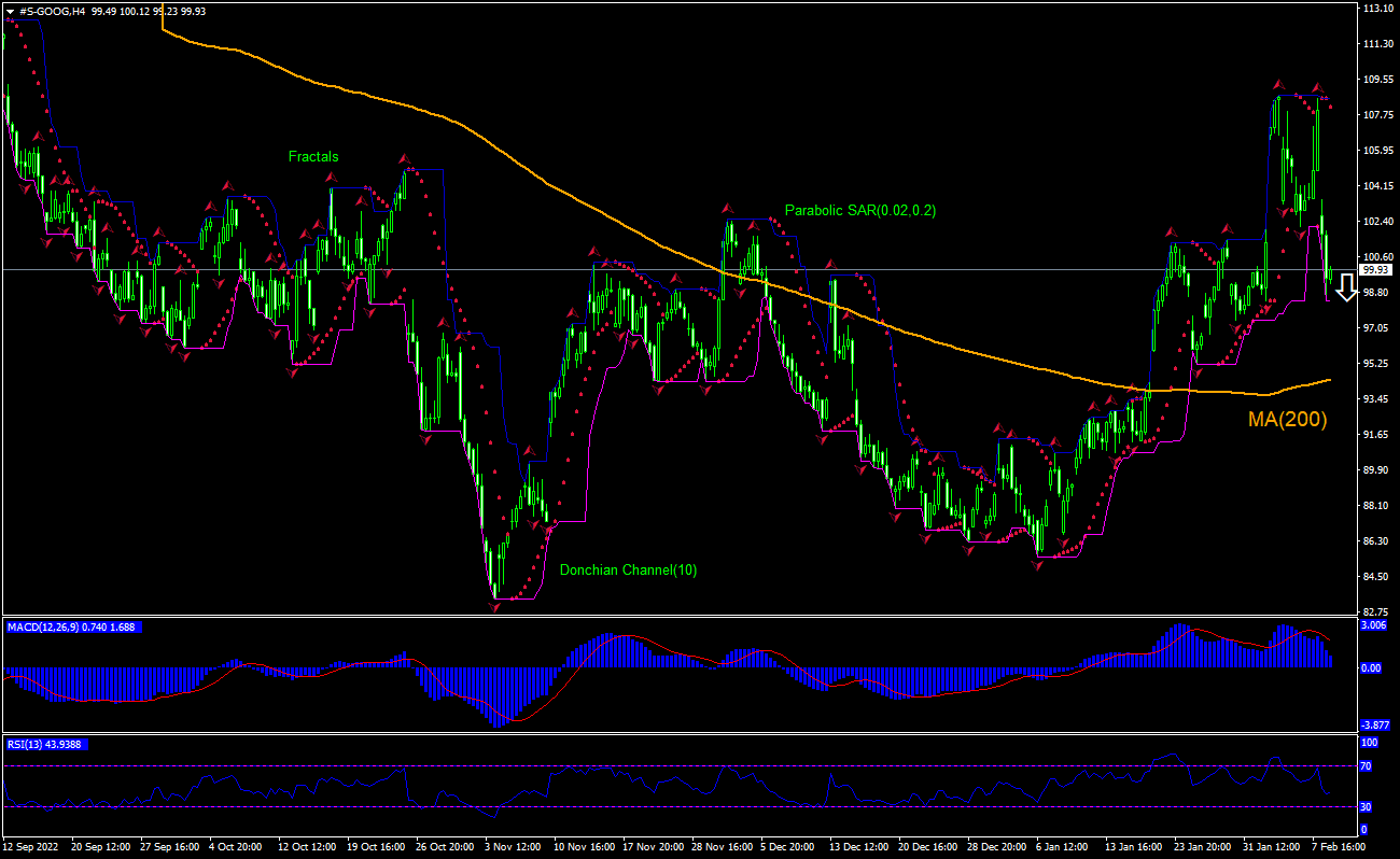 The technical analysis of the GOOGLE stock price chart on 4-hour timeframe shows #S-GOOG,H4 is retracing down toward the 200-period moving average MA(200) after rebounding to 5-month high a week ago. We believe the bearish momentum will continue after the price breaches below the lower boundary of Donchian channel at 98.37. This level can be used as an entry point for placing a pending order to sell. The stop loss can be placed above the fractal high at 108.6. After placing the order, the stop loss is to be moved every day to the next fractal high following Parabolic indicator signals. Thus, we are changing the expected profit/loss ratio to the breakeven point. If the price meets the stop loss level (108.6) without reaching the order (98.37), we recommend cancelling the order: the market has undergone internal changes which were not taken into account.