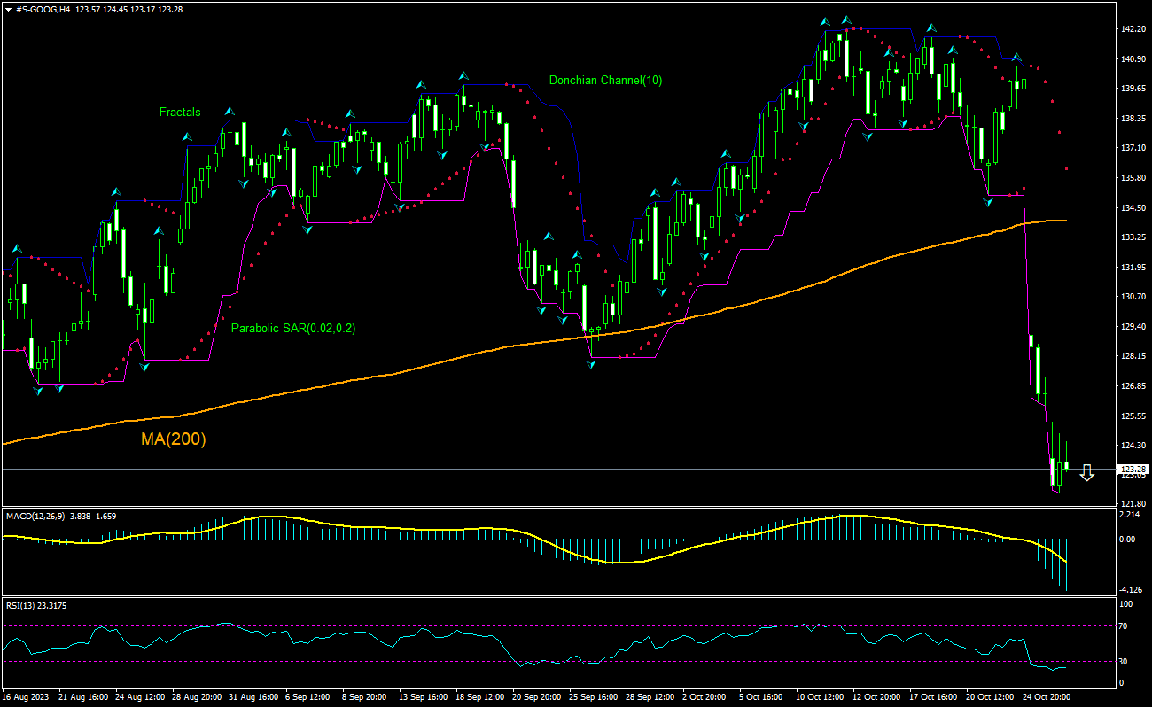The technical analysis of the GOOGLE stock price chart on 4-hour timeframe shows #S-GOOG,H4 is retreating after breaching below the 200-period moving average MA(200) which is leveling off. RSI is in oversold zone. We believe the bearish momentum will continue after the price breaches below the lower boundary of Donchian channel at 122.24. This level can be used as an entry point for placing a pending order to sell. The stop loss can be placed above 128.64. After placing the order, the stop loss is to be moved every day to the fractal high indicator following Parabolic indicator signals. Thus, we are changing the expected profit/loss ratio to the breakeven point. If the price meets the stop loss level (128.64) without reaching the order (122.24), we recommend cancelling the order: the market has undergone internal changes which were not taken into account.