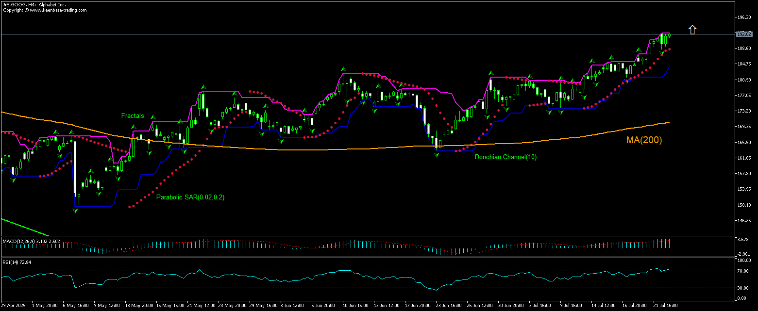 The technical analysis of the GOOGLE stock price chart on 4-hour timeframe shows #S-GOOG,H4 is rebounding after testing the 200-period moving average MA(200) as the price retreated to 9-week low a month ago. RSI is in the overbought zone. We believe the bullish momentum will continue after the price breaches above the upper boundary of Donchian channel at 192.43. This level can be used as an entry point for placing a pending order to buy. The stop loss can be placed below at 188.40. After placing the order, the stop loss is to be moved every day to the next fractal low indicator following Parabolic indicator signals. Thus, we are changing the expected profit/loss ratio to the breakeven point. If the price meets the stop loss level (188.40) without reaching the order (192.43), we recommend cancelling the order: the market has undergone internal changes which were not taken into account.