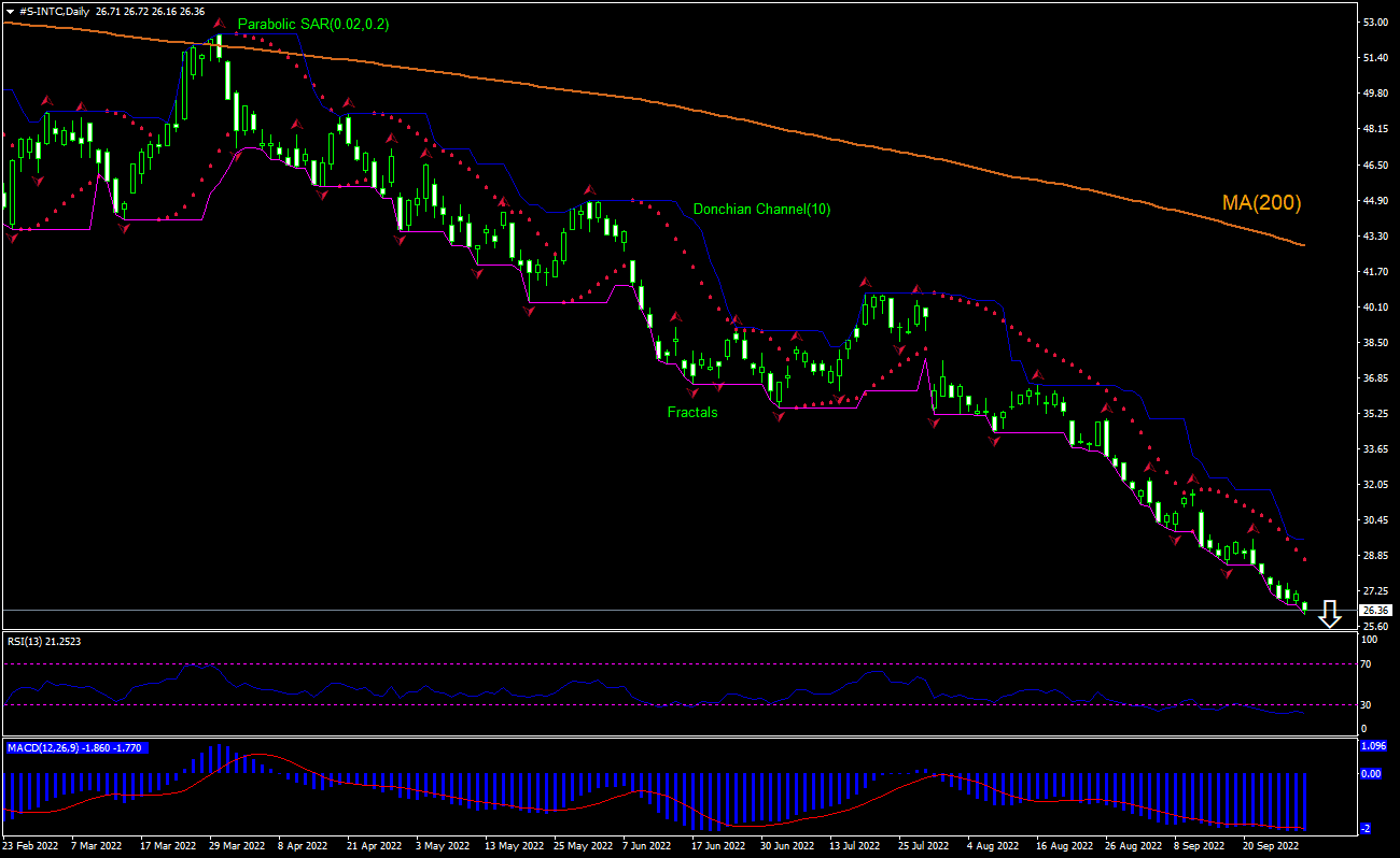 The technical analysis of the Intel stock price chart on daily timeframe shows #S-INTC,Daily is retreating under the 200-day moving average MA(200) after a brief breach above the MA(200) six months ago. The RSI is in the oversold zone. We believe the bearish momentum will continue after the price breaches below the lower boundary of Donchian channel at 26.16. This level can be used as an entry point for placing a pending order to sell. The stop loss can be placed above the fractal high at 29.56. After placing the order, the stop loss is to be moved every day to the next fractal high, following Parabolic indicator signals. Thus, we are changing the expected profit/loss ratio to the breakeven point. If the price meets the stop loss level (29.56) without reaching the order (26.16), we recommend cancelling the order: the market has undergone internal changes which were not taken into account.