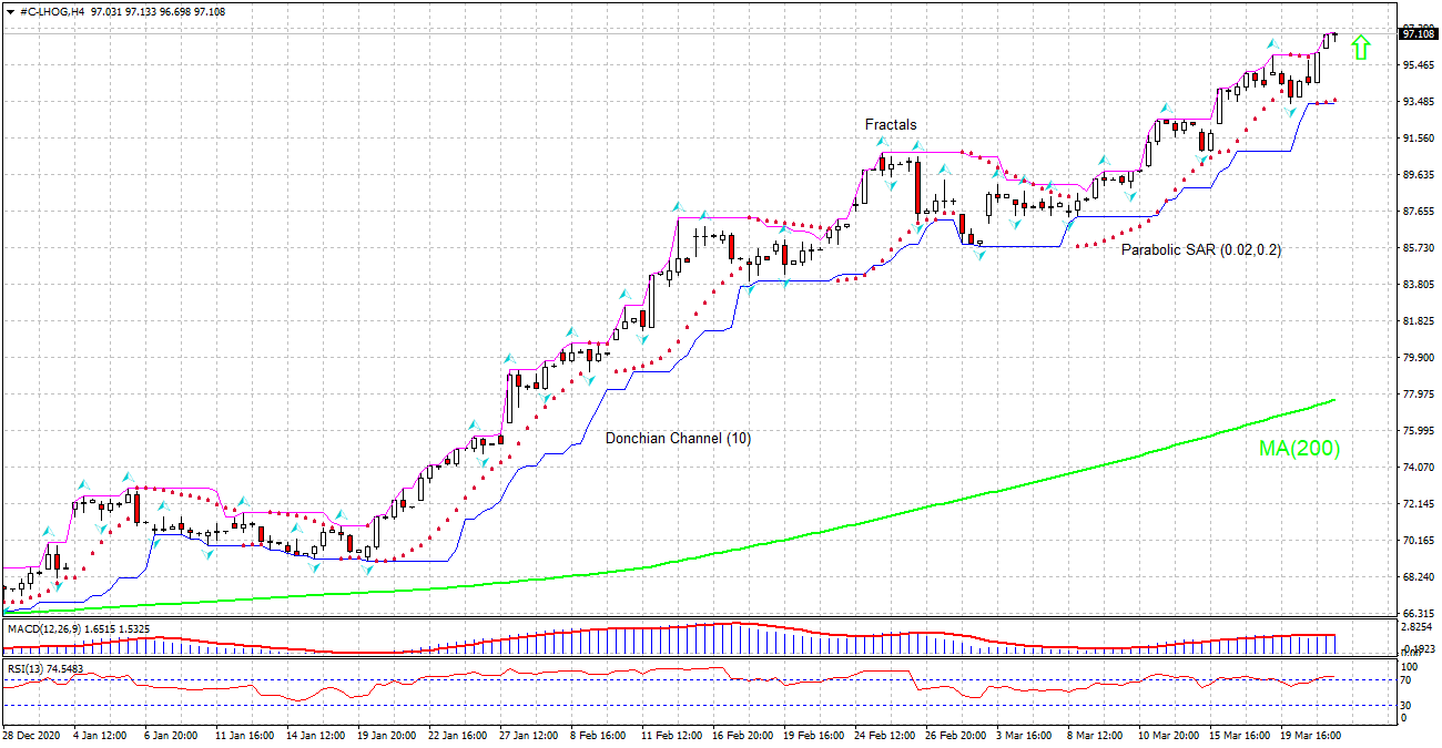 On the 4-hour timeframe #C-LHOG: H4 is rallying above the 200-period moving average MA(200), which is rising itself. We believe the bullish momentum will continue as the price breaches above the upper Donchian boundary at 97.13. A pending order to buy can be placed above that level. The stop loss can be placed below 93.37. After placing the order, the stop loss is to be moved every day to the next fractal low, following Parabolic signals. Thus, we are changing the expected profit/loss ratio to the breakeven point. If the price meets the stop loss level (93.37) without reaching the order (97.13), we recommend cancelling the order: the market has undergone internal changes which were not taken into account.