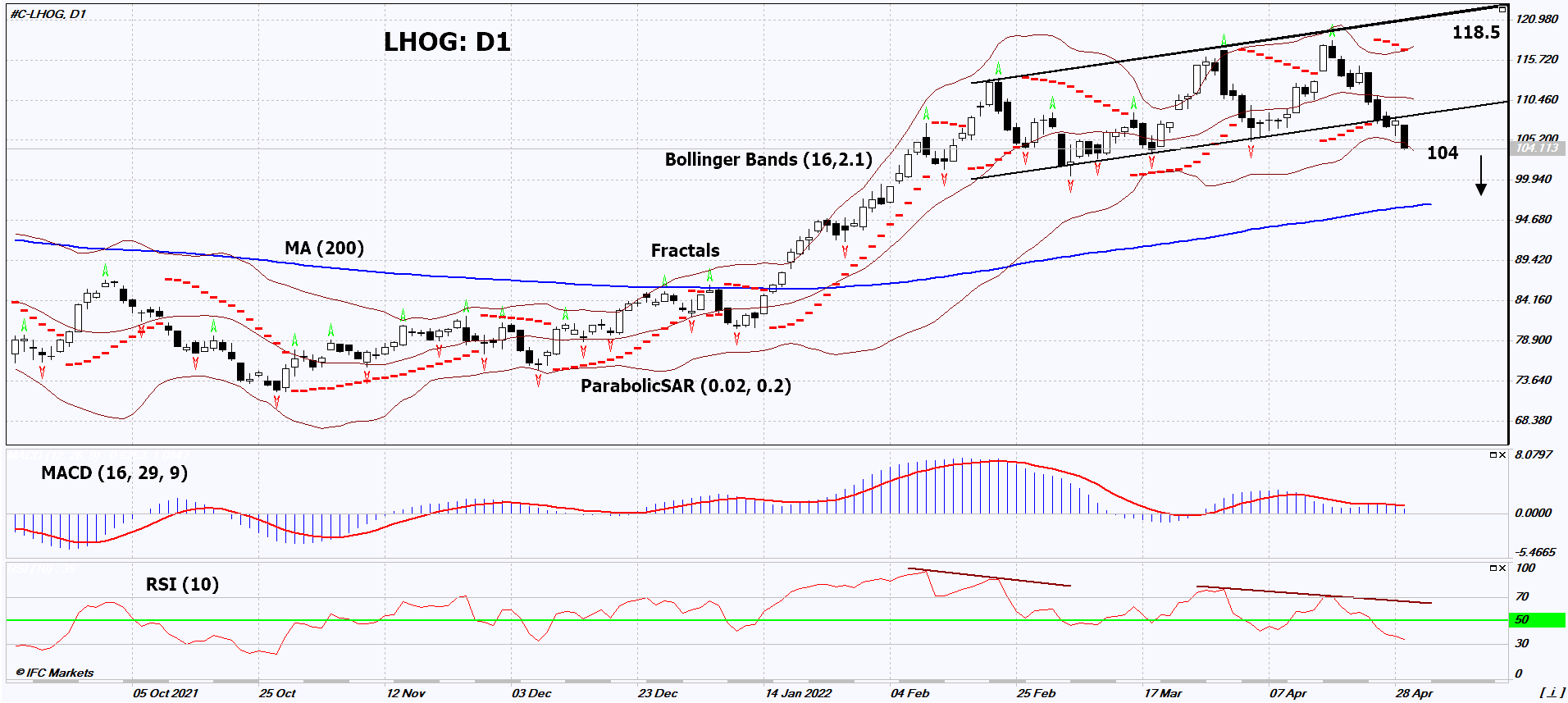 On the daily timeframe, LHOG: D1 went down from the rising channel. A number of technical analysis indicators formed signals for further decline. We do not rule out a bearish movement if LHOG: D1 drops below its latest low and lower Bollinger band: 104. This level can be used as an entry point. Initial risk cap possible above latest up fractal, high since June 2021, upper Bollinger band and Parabolic signal: 118.5. After opening a pending order, we move the stop following the Bollinger and Parabolic signals to the next fractal high. Thus, we change the potential profit/loss ratio in our favor. The most cautious traders after making a trade can switch to a four-hour chart and set a stop loss, moving it in the direction of movement. If the price overcomes the stop level (118.5) without activating the order (104), it is recommended to delete the order: there are internal changes in the market that were not taken into account.