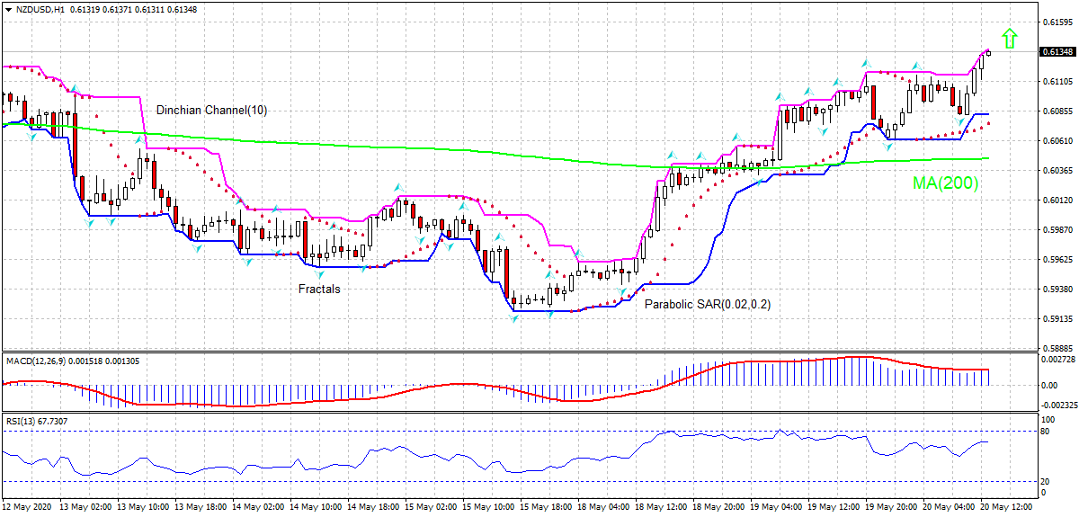 On 1-hour timeframe NZDUSD: H1 is rising above the 200-period moving average MA(200) which is rising itself. We believe the bullish movement will continue after the price breaches above the upper bound of the Donchian channel at 0.6133. A level above this can be used as an entry point for placing a pending order to buy. The stop loss can be placed below 0.6083. After placing the order, the stop loss is to be moved to the next fractal low, following Parabolic signals. Thus, we are changing the expected profit/loss ratio to the breakeven point. If the price meets the stop loss level without reaching the order, we recommend cancelling the order: the market has undergone internal changes which were not taken into account.