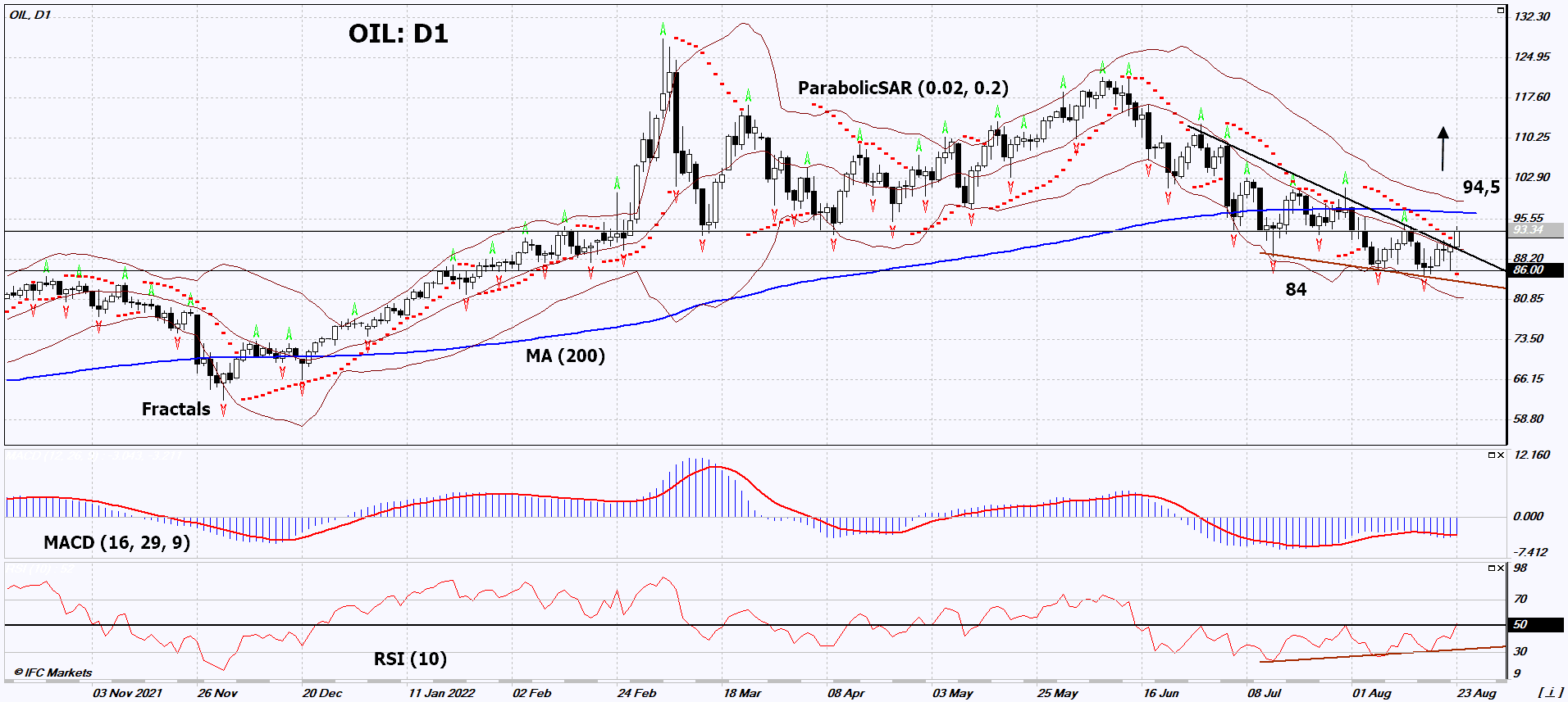 Opinion was expressed by Abdulaziz bin Salman (Minister of Energy of Saudi Arabia) regarding the information about a possible mitigation of Iran's demands (position) during negotiations with Western countries on the "nuclear deal". The next OPEC+ meeting is scheduled for September 5, 2022. It should be noted that OPEC+ production in July was already 2.89 million barrels per day (bpd) less than previously approved quotas. This was mainly due to Western economic sanctions against Russia. A significant factor in the rise in oil prices may be its use for heating and power generation in European countries against the backdrop of rising natural gas prices on August 22, 2022 to $3,000 per thousand cubic meters (according to the Title Transfer Facility).