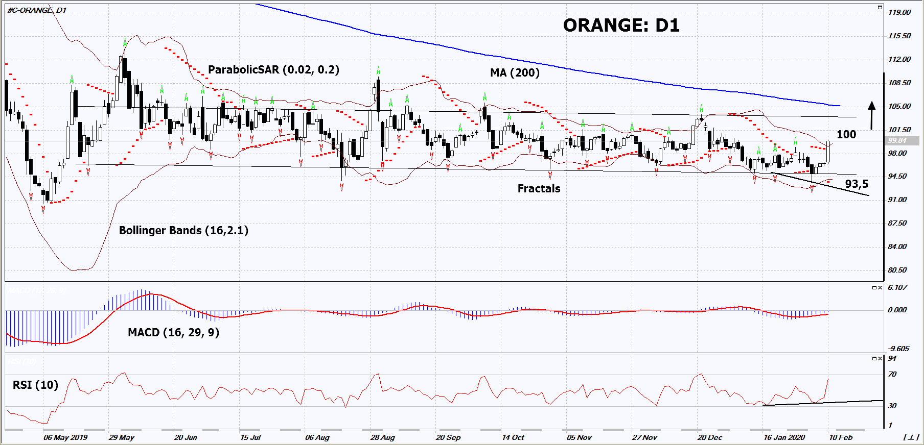 On the daily timeframe, the ORANGE: D1 is in a neutral trend. Now it has bounced off its lower boundary and is correcting up. A number of technical analysis indicators formed buy signals. The bullish momentum may develop in case ORANGE rises above its last high and the upper Bollinger band at 100. This level may serve as an entry point. The initial stop loss may be placed below the last fractal low, the low since May 2019 and the Parabolic signal at 93.5. After opening the pending order, we shall move the stop to the next fractal low following the Bollinger and Parabolic signals. Thus, we are changing the potential profit/loss to the breakeven point. More risk-averse traders may switch to the 4-hour chart after the trade and place there a stop-loss moving it in the direction of the trade. If the price meets the stop level (93.5) without reaching the order (100), we recommend closing the position: the market sustains internal changes that were not taken into account
