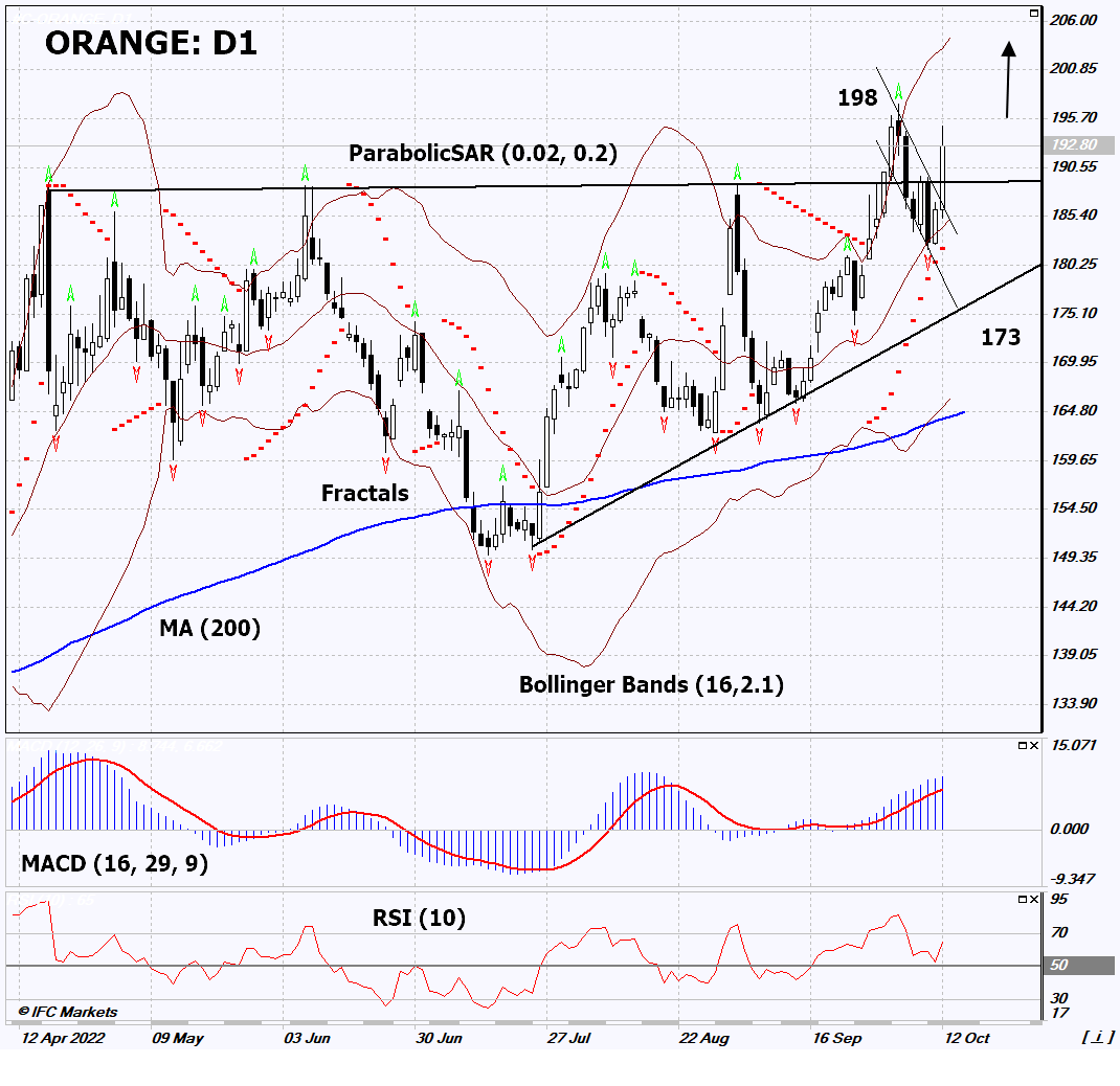 On the daily time frame, ORANGE: D1 came out of the triangle and the bullish flag. A number of technical analysis indicators formed signals for further growth. We do not rule out a bullish movement if ORANGE: D1 rises above the latest up fractal and the high since December 2016: 198. This level can be used as an entry point. The initial risk limit is possible below the lower border of the triangle, the last 2 lower fractals and the Parabolic signal: 173. After opening a pending order, we move the stop following the Bollinger and Parabolic signals to the next fractal low. Thus, we change the potential profit/loss ratio in our favor. The most cautious traders, after making a trade, can switch to a four-hour chart and set a stop loss, moving it in the direction of movement. If the price overcomes the stop level (173) without activating the order (198), it is recommended to delete the order: there are internal changes in the market that were not taken into account.