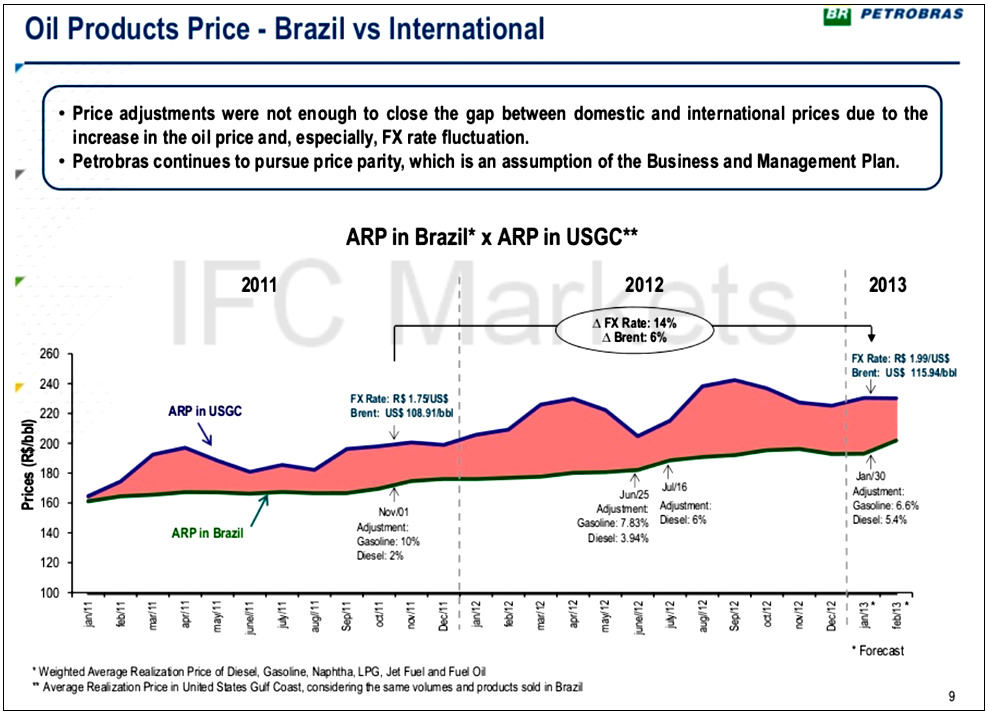 Good afternoon, dear investors. Today we consider the spread instrument which discloses the internal structure of the Brazilian economy: №1 state by GDP absolute value in Latin America. One third of the Brazilian GDP accounts for the industrial sector, which is traditionally dependent on energy prices. Energy market in Brazil is almost fully controlled by the Petryleo Brasileiro (Petrobras) corporation: the main shareholder is the Government of Brazil which owns more than 32% of capitalization. The company is currently the dominant player in the oil and gas sector, as it controls more than 95% of crude production and 90% of natural gas reserves in Brazil. Moreover, Petrobras owns completely the oil and gas transmission network in Brazil and 11 oil refineries. Unfortunately, there is no more good news for PBR. Since 2010 together with the Brazilian economy recovery, energy shortages continue to increase. At the moment the country’s oil shortage is more than 670 thousand barrels per year, while imports continue to increase. However, exports decreased: there was a significant drop of 13% in 2012.