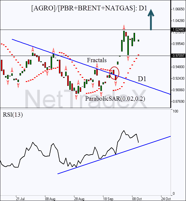 The daily chart of the portfolio spread was built in NetTradeX. Only the opening and closing prices of the daily candlestick are used for calculation acceleration. We can see the price broke the bearish trend line and hit a new high in the green zone. ParabolicSAR confirms the uptrend, as well as the oscillator does. The trend is likely to continue when there will be the resistance breach at 1.02440, which was built on the basis of the Bill Williams fractal. Stop Loss is recommended to be placed at the support level of 0.96414, which is strengthened by the fractal and Parabolic historical value.