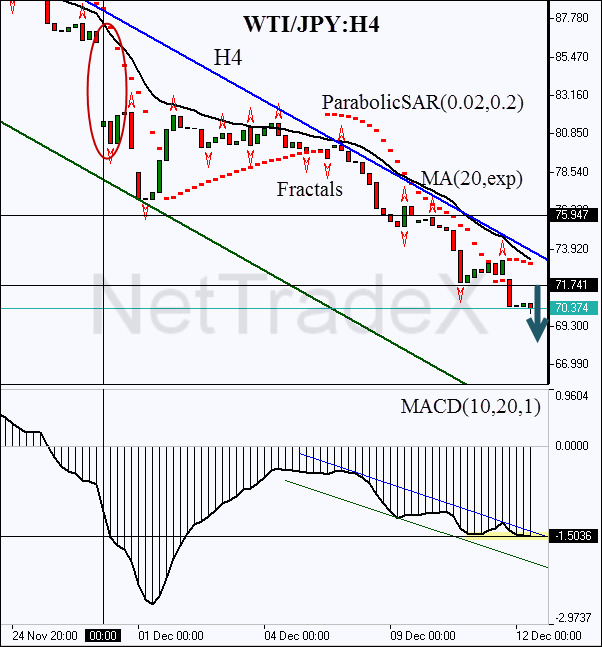 Here we consider the daily closing/opening price chart of the given instrument. It was composed in NetTradeX trading platform. We can see that the exponential moving average is moving along the bearish trend line, confirming the trend. The price crossed it downwards and broke the fractal support at 71.741. At the same time there was a ParabolicSAR reversal in the direction of the red zone.
