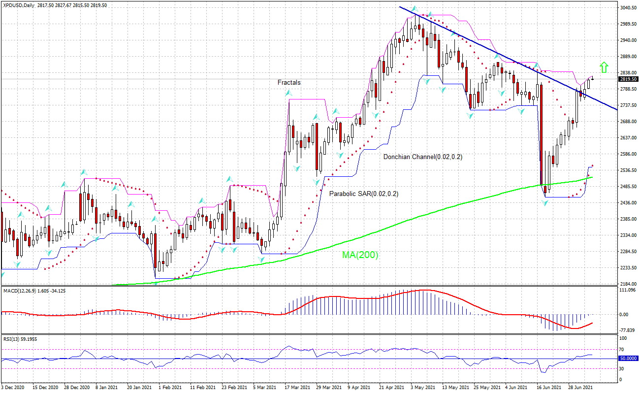 The XPDUSD technical analysis of the price chart on the daily timeframe shows XPDUSD,Daily has breached the resistance line above the 200-day moving average MA(200), which is rising. We believe the bullish momentum will continue after the price breaches above the upper boundary of Donchian channel at 2841. This level can be used as an entry point for placing a pending order to buy. The stop loss can be placed below the lower Donchian boundary at 2549.99. After placing the order, the stop loss is to be moved every day to the next fractal low, following Parabolic signals. Thus, we are changing the expected profit/loss ratio to the breakeven point. If the price meets the stop loss level (2549.99) without reaching the order (2841), we recommend cancelling the order: the market has undergone internal changes which were not taken into account.