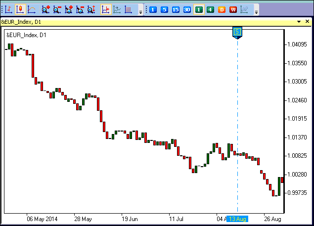Yukarıdaki şekilde euro enstrümanın baz kısmına (üst tablo), etalon portföy ise karşıt kısmına giriyor (alt tablo). Endeks oluşturulduktan sonra ticaret platformu kütüphanesine eklenebilir. Endeksin açılış ve kapanış fiyatları baz ve karşıt kısımların oranları temelinde otomatik olarak hesaplanır (aşağıdaki şekil).