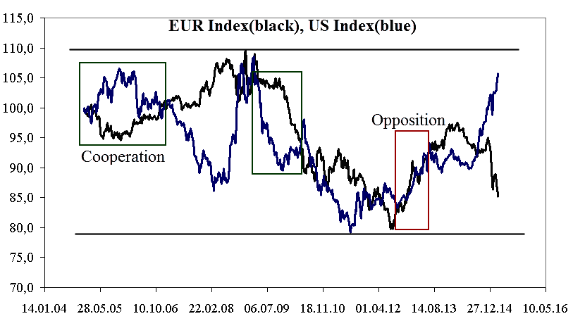 Grafikleri Excel'e aktaralım ve onları tek ölçeğe getirelim. Bu EURi ve vsUSDi endekslerini 2005 Ocak-Mart döneminde bir hafta zaman aralığında karşılaştırmaya izin verir. Baçlangıç değeri olarak yüzde 100 seviyesi kabul edilmiştir. Döviz endeksleri yüzde 80-110 aralığında hareket eder: dalgalanmalar yüzde +/- 20, yani başlangıç değeri amplitüdünün yüzde 70 altında. İstatistiksel olarak, bu Avrupa Merkez Bankası ve Fed'in analiz boyunca bağımsız para politikası yürütmedikleri anlamına geliyor. Seçilen tarihsel dönem içinde yüzde 50 pozitif korelasyon katsayısı merkez bankalarının muhtemelen işbirliğinden (kırmızı dikdörtgen) çok mücadele ettiklerine (yeşil dikdörtgen) dikkat çekti. Son kırmızı dikdörtgen grafiğin son kısmında (2012-2013) her iki para biriminin aynı zamanda güçlendiğini gösteriyor. Haftalık grafikte euro endeksi (siyah çizgi) ve dolar endeksi (mavi çizgi) gösterilmiştir.