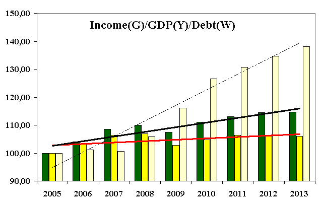 Aşağıdaki şekil Euro bölgesi ülkelerinin kişi başına gelir, GSYH ve kamu borçlarının grafiğini gösterir. 2009 yılında ulusal borç (notkalı çizgi) GSYH (kırmızı çizgi) ve gelirden (siyah çizgi) çok daha hızlı büyümeye başlıyor. QE programı başlatılır başlatılmaz ticaret dengesi artmaya başladı. Emel açıktı: nüfus gelirlerini yükseltmek. Ancak GSYİH büyümesi ve gelirler arasındaki uçurum giderek büyüyordu. Aynı şey GSYH ve ulusal borç için de geçerliydi, ki bu da ıraksayan regresyon çizgileri ile kanıtlanıyor. Gelir büyümesi GSYİH büyümesini yüzde 3.4 geride bırakırken borç GSYH'den yüzde 1.64 daha hızlı artıyordu. Böylelikle Euro bölgesinde parasal müdahale GSYH büyümesinden ziyade gelirlerdeki artışa katkıda bulunan sermayeyi çekmeye yardımcı olduğu sonucuna varılabilir.