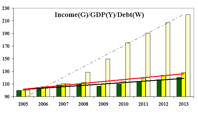 Kişi başına düşen gelir (yeşil), GSYH (sarı) ve ulusal borç (beyaz):