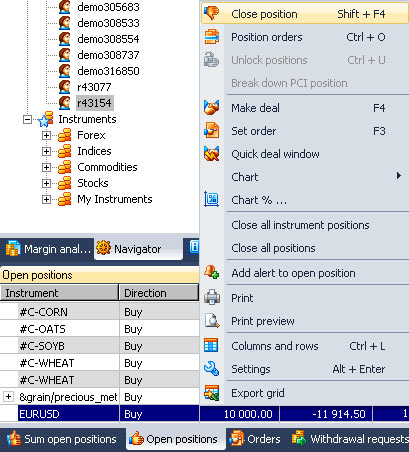 - "Açık pozisyonlar" penceresinde pozisyon satırına sağ tıklayın ve bağlam menüsünden "Pozisyon kapanışı" seçeneğini seçin.
