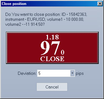 Önce izin verilen Sapma'yı girebilirsiniz (pip'ler ile, yani EURUSD için, örneğin, 1 pip = 0.00001). Pozisyonu "brokerin fiyatı" ile kapatmak için "herhangi fiyata" işaretleyin. Piyasada yüksek volatilite ihtimalinde pozisyonunuz "Sapma" alanında girdiğiniz sınırlama çerçevesinde kapatılacaktır.
