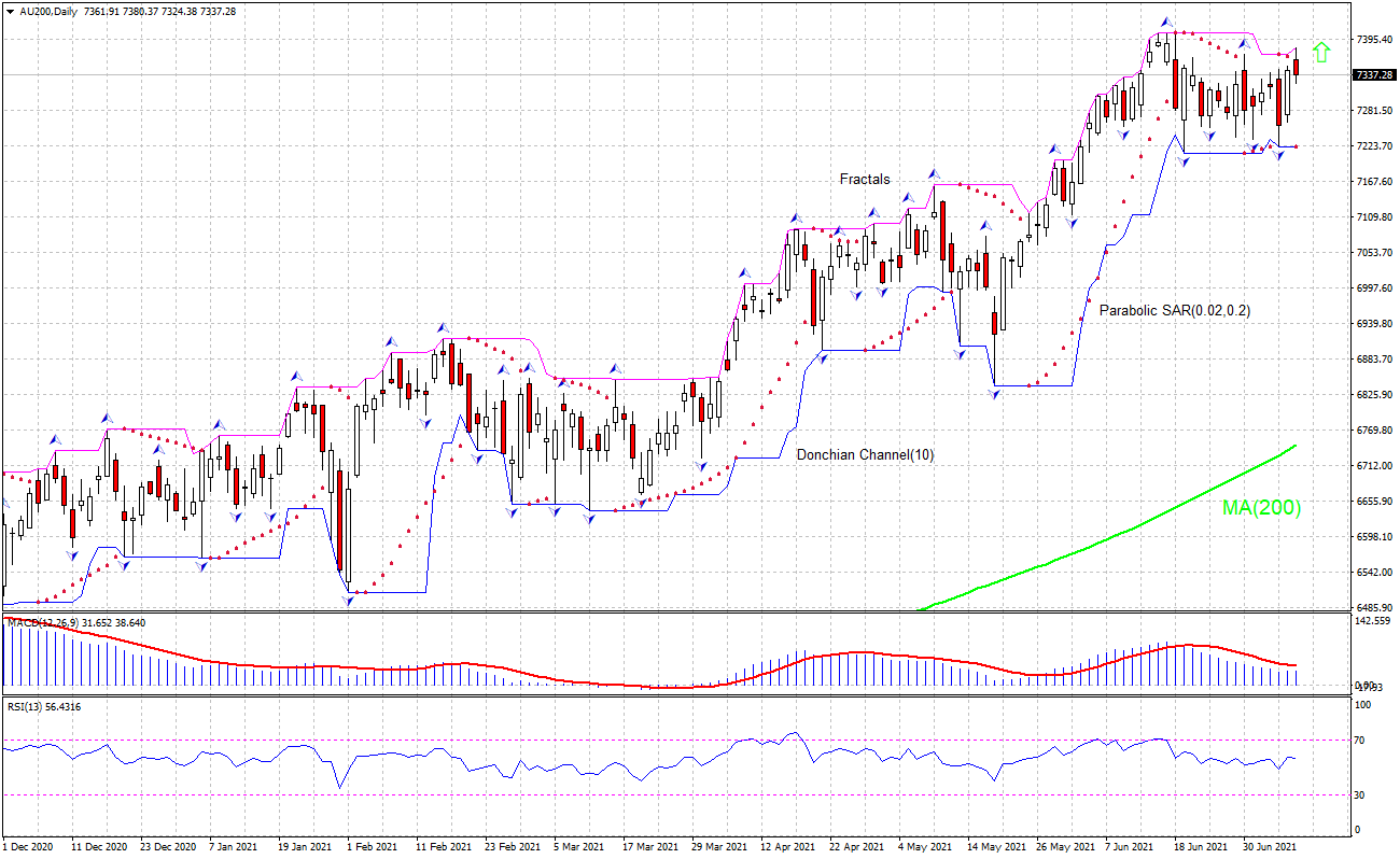 The AU200 technical analysis of the price chart on daily timeframe shows AU200,Daily is attempting to rebound after pullback following a record close in mid-June. It has rallied above the 200-day moving average MA(200) which is rising itself. We believe the bullish momentum will continue after the price breaches above the upper Donchian boundary at 7380.37. This level can be used as an entry point for placing a pending order to buy. The stop loss can be placed below 7223.06. After placing the pending order the stop loss is to be moved every day to the next fractal low, following Parabolic signals. Thus, we are changing the expected profit/loss ratio to the breakeven point. If the price meets the stop-loss level (7223.06) without reaching the order (7380.37) we recommend cancelling the order: the market sustains internal changes which were not taken into account.