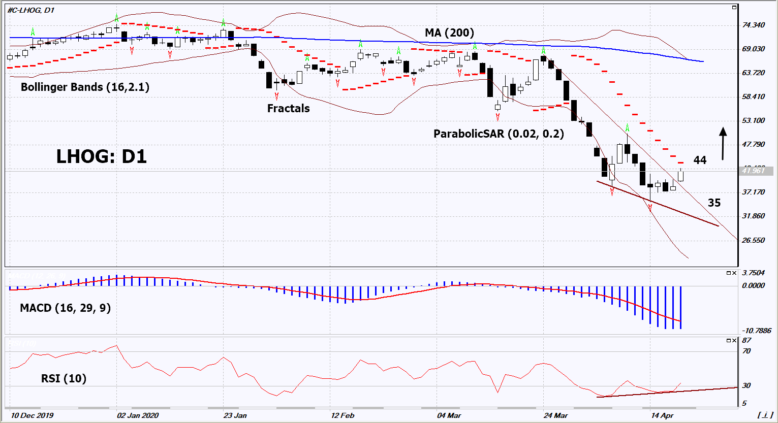On the daily timeframe, LHOG: D1 went up from the “Triangle” graphical price pattern and at the same time from the downtrend, since the upper border of the triangle coincided with its resistance line. A range of indicators of technical analysis formed signals for a further increase. We do not exclude bullish movement if LHOG rises above the Parabolic signal: 44. This level can be used as an entry point. You can set a stop loss below the last lower fractal and minimum since 2002: 35. Note that the historical minimum was in November 1998 (28.5). After opening the pending order, we move the stop loss following the Bollinger and Parabolic signals to the next fractal minimum. Thus, we change the potential profit / loss ratio in our favor. After the transaction, the most risk-averse traders can switch to a four-hour chart and set a stop loss, moving it in the direction of the trend. If the price meets the stop level (35) without activating the order (44), it is recommended to delete the order: some internal changes in the market were not taken into account.